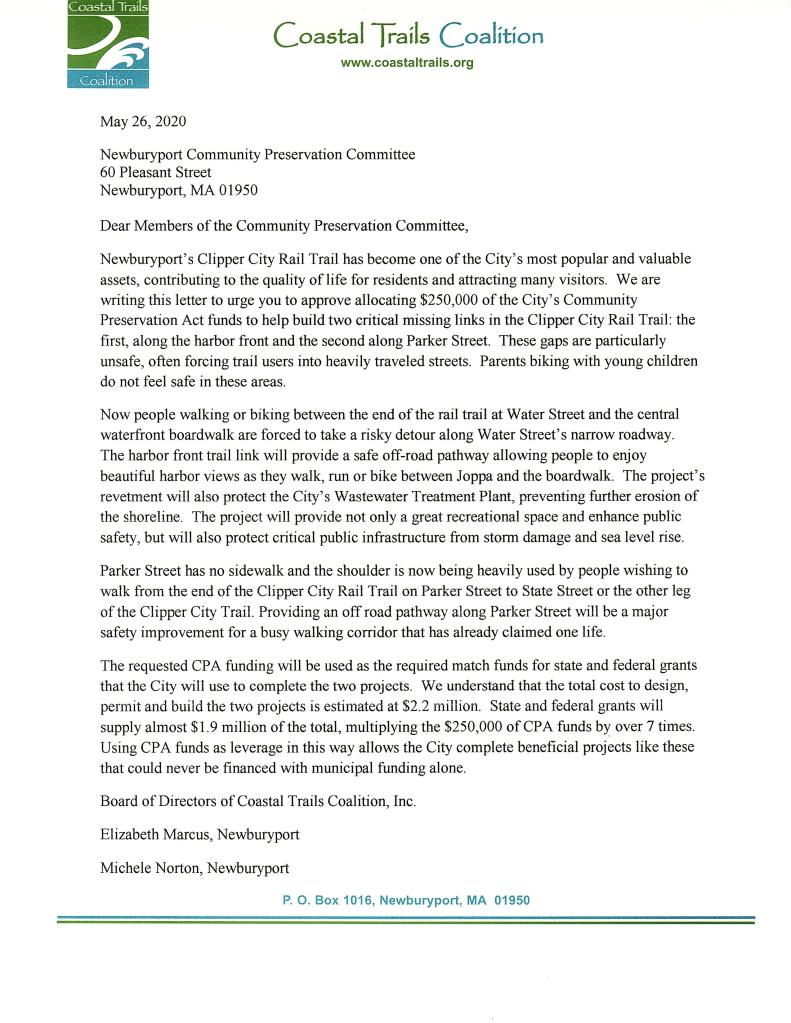 The Coastal Trails Coalition supports the request by the City of Newburyport for CPA Funding to close the gaps in the Clipper City Rail Trail.
